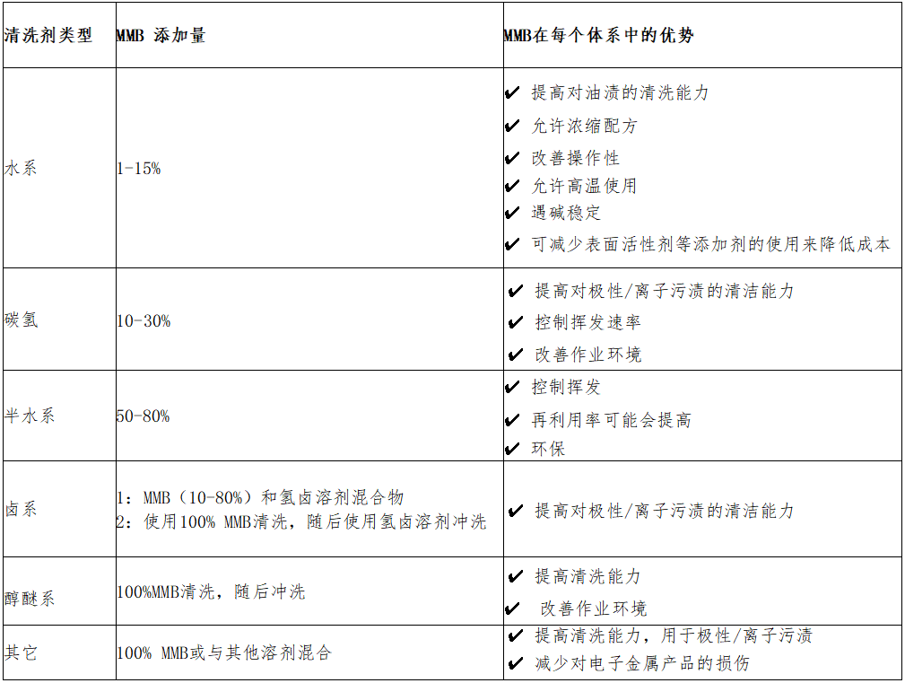· 溶解力好:MMB表現(xiàn)出水油兩親性,適合用來(lái)清洗油污和離子污漬的混合物;